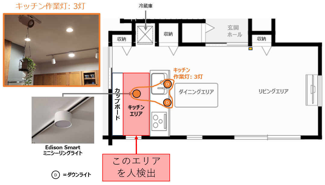今回は単純にキッチンのエリアに人が入ると照明がオンになって、キッチンのエリアの人検出が無くなって2分半経過すると照明がオフになるようにしてみました。周囲が明るい時は点灯させないなんてことも考えてはみましたが、我が家のキッチンエリアは日中でもあまり明るくないのでまぁこれでいいかなと。自動で挙動を変えてしまうと逆に「あれ?点灯しない」なんとことも起きますし。